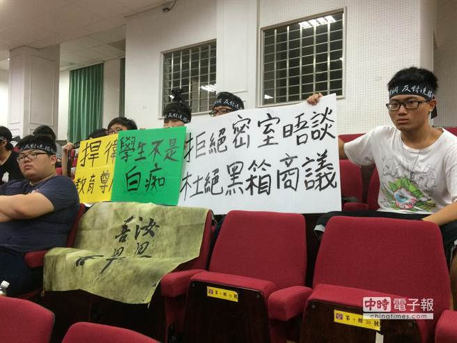 學生聽到這些言論,立刻就拉起反對標語「吾思台、汝思華」及綁起「反對洗腦、反黑箱微調課綱」頭巾,還有「學生不是白痴」、「拒絕密室晤談 杜絕黑箱商議」、「捍衛教育尊嚴」。
